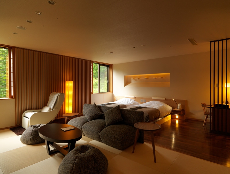 북해도 고급 료칸 리조트 체인인 츠루가 리조트의 나무을 테마로 한 고급 료칸